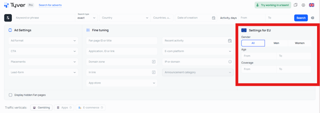 Important advantage of the European Union: spy tools provide extended statistics for EU ads — including the gender and age of the audience targeted by each campaign.