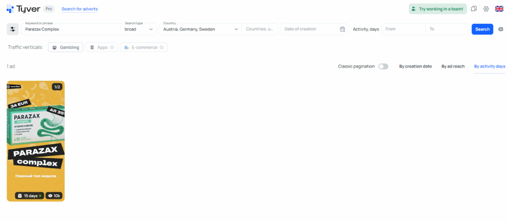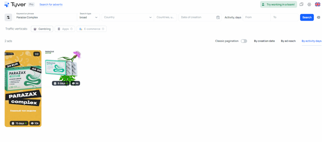 As we can see, searching by offer names yields very few ad examples. You can increase the number of results by removing the GEO targeting restriction — although that doesn’t always help. For instance, when searching for Parazax Complex, the number of creatives doubles — from just one to a whole two.